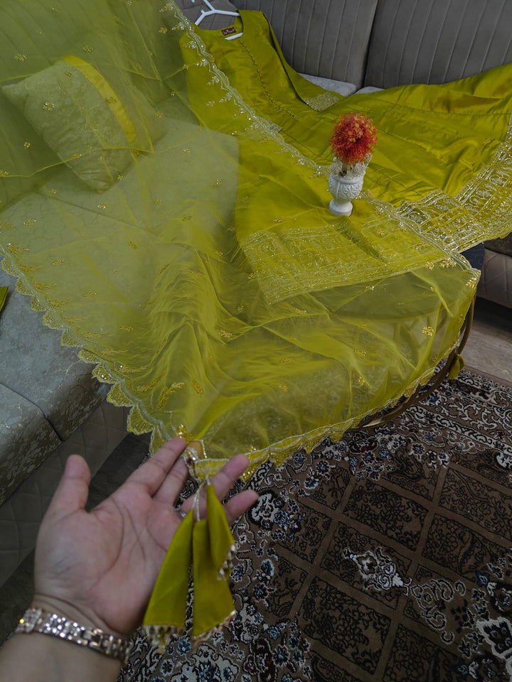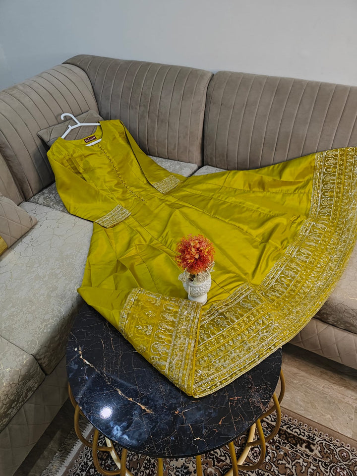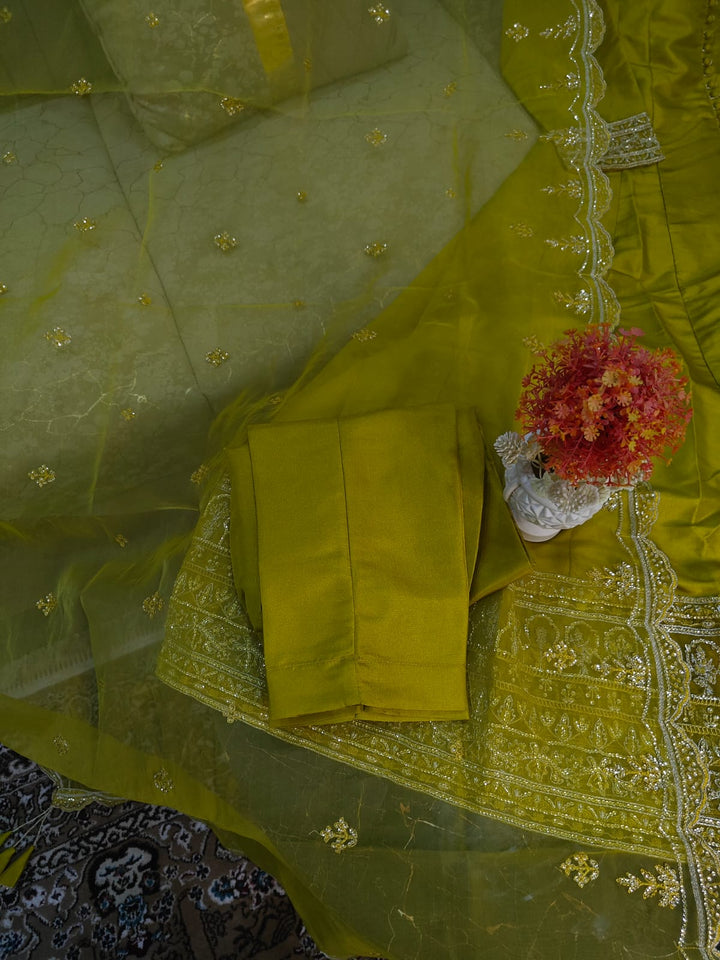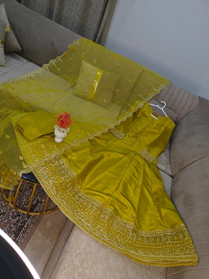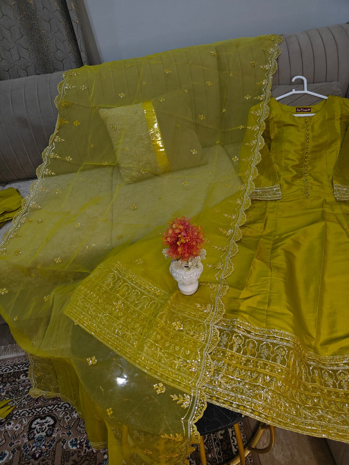Cotton silk fabric flairy maxi embroidered front back daman and sleeves plain trouser and organza cutwork beautiful tussul dupatta