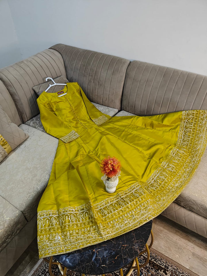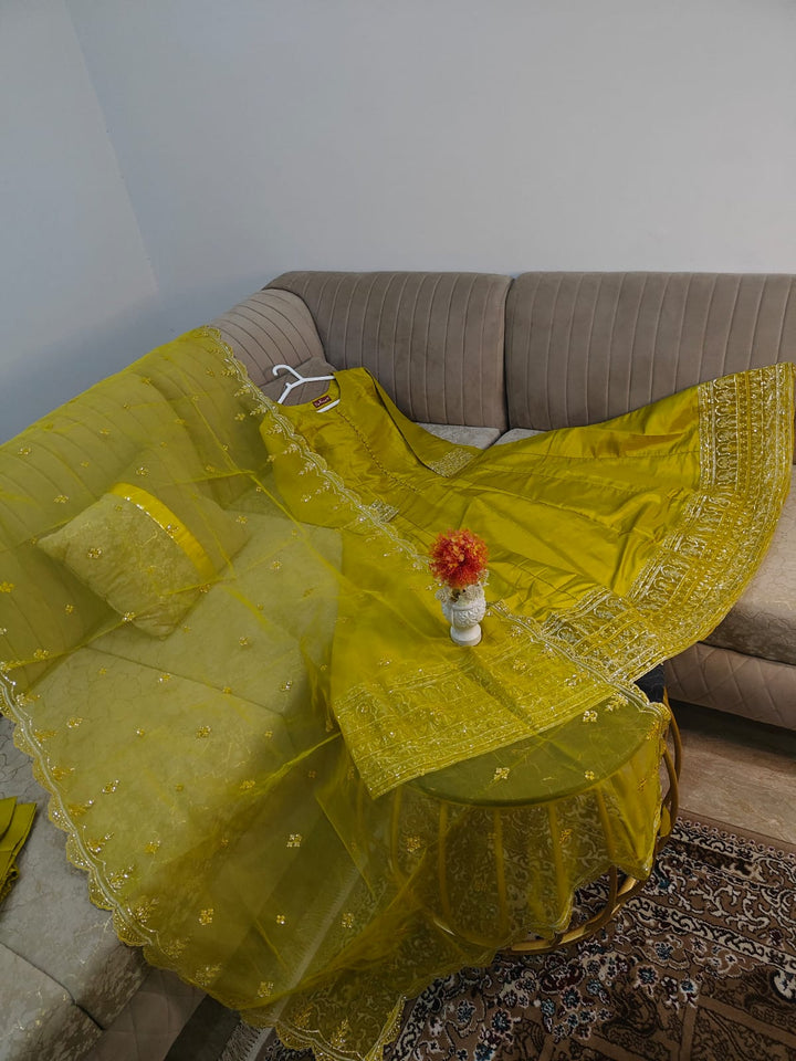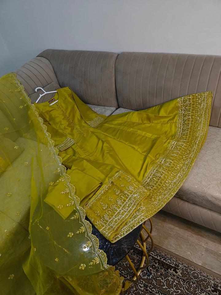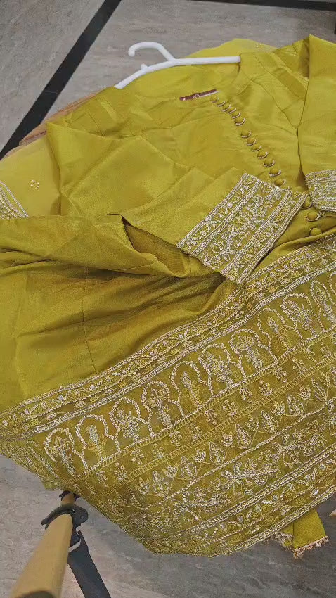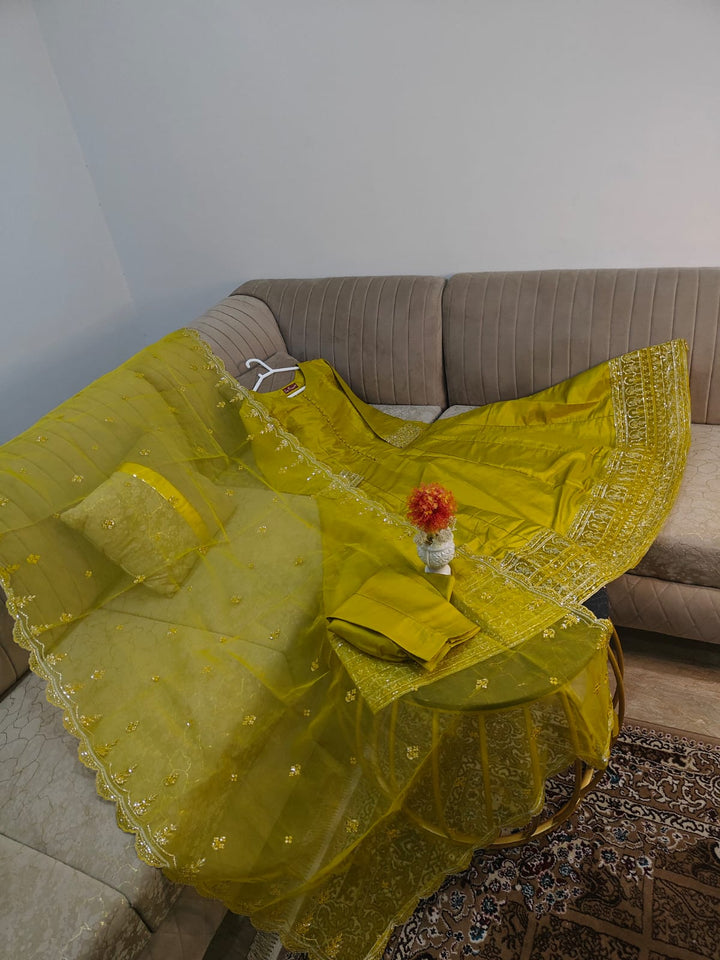 Cotton silk fabric flairy maxi embroidered front back daman and sleeves plain trouser and organza cutwork beautiful tussul dupatta