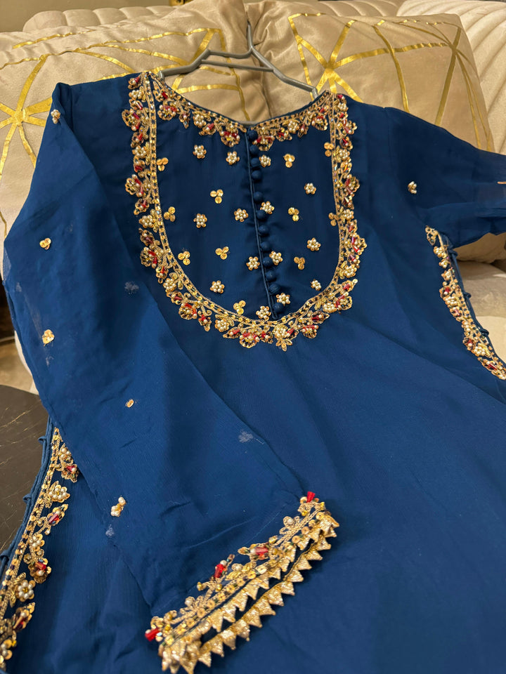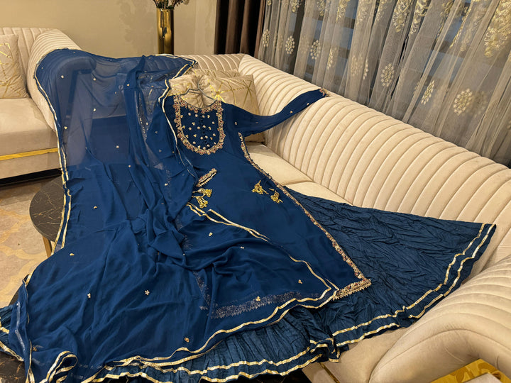 Chifon hand work stone dbka & pearl work long shirt wd crushsilk shrara & chifon gota & pearl work dopta
